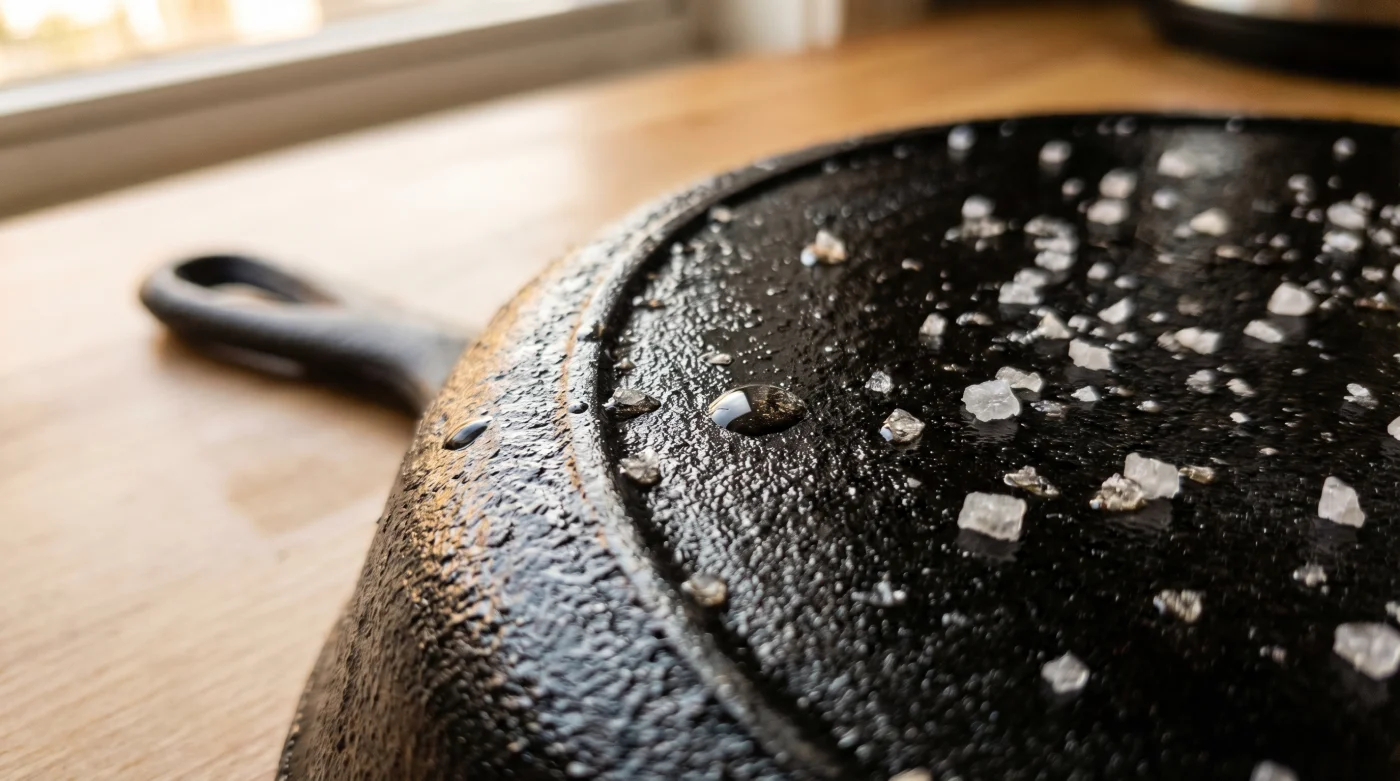 Your tactical toolkit for this daily reset requires zero electricity and zero heat. You only need the coarse salt, a simple scrubbing implement, cold tap water, and a reliable drying towel. The salt provides gentle exfoliation, pulling the grease away from the iron to keep the cooking surface remarkably smooth without stripping the polymerized base layer.