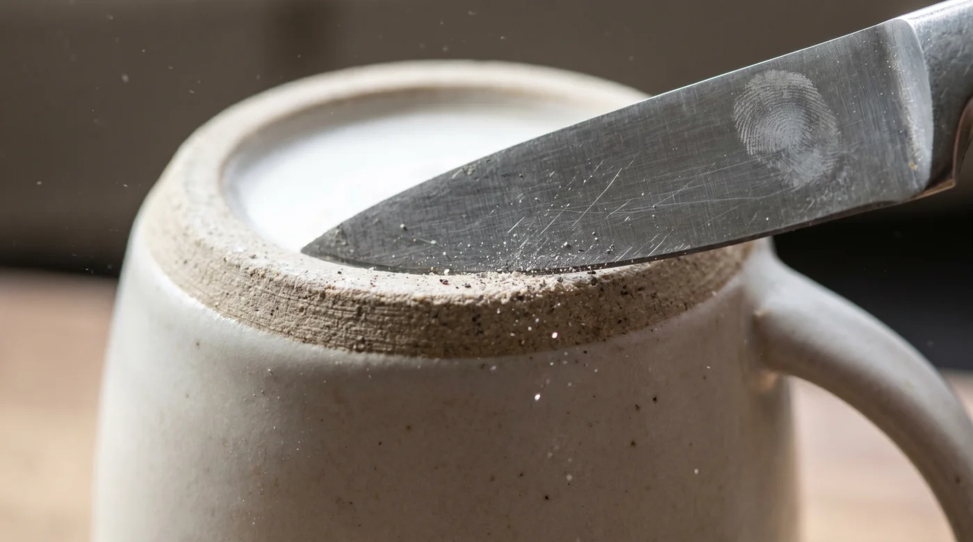 To stand those microscopic teeth back up, you don’t necessarily need to grind away layers of steel. You just need a material harder than the knife itself to act as a runway. Enter the humble ceramic coffee mug. Flip it over, and you will notice a gritty, unglazed ring at the base. That rough circle is fired aluminum oxide, which happens to be the exact same abrasive material used in professional sharpening rods.
