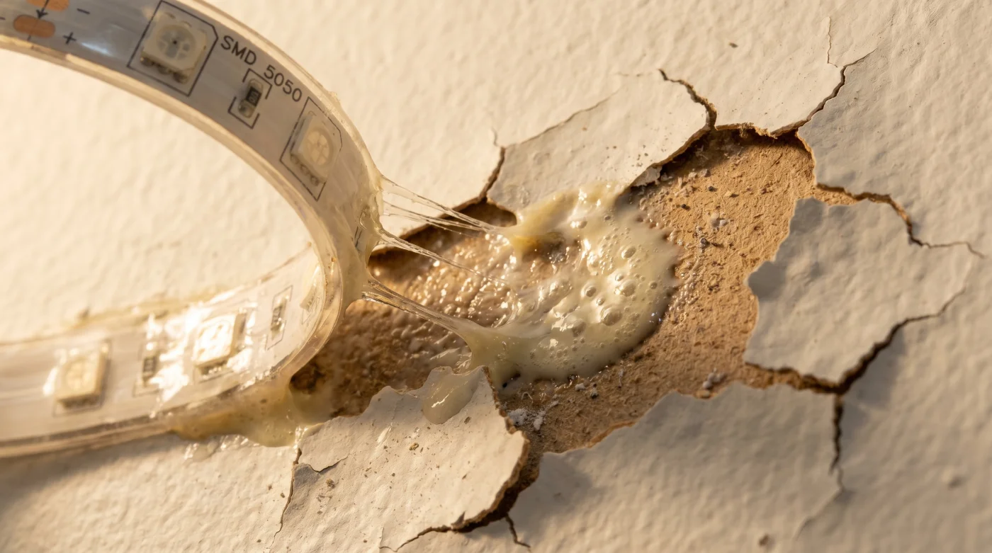 The sticky backing on cheap and mid-tier light strips is loaded with synthetic resins designed to keep the tape flexible and tacky during shipping. When you press this adhesive onto a wall, those plasticizers slowly seep into the porous surface of the latex paint. Over the course of a few weeks, the tape liquefies the protective binders in the paint, effectively resetting the curing process and fusing the light strip permanently to the drywall paper.