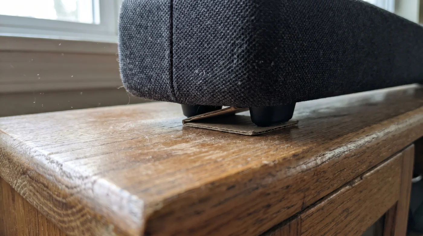 - Lift the front edge of the soundbar gently while the actors are speaking, wedging your chosen material about an inch inward from the left and right corners.