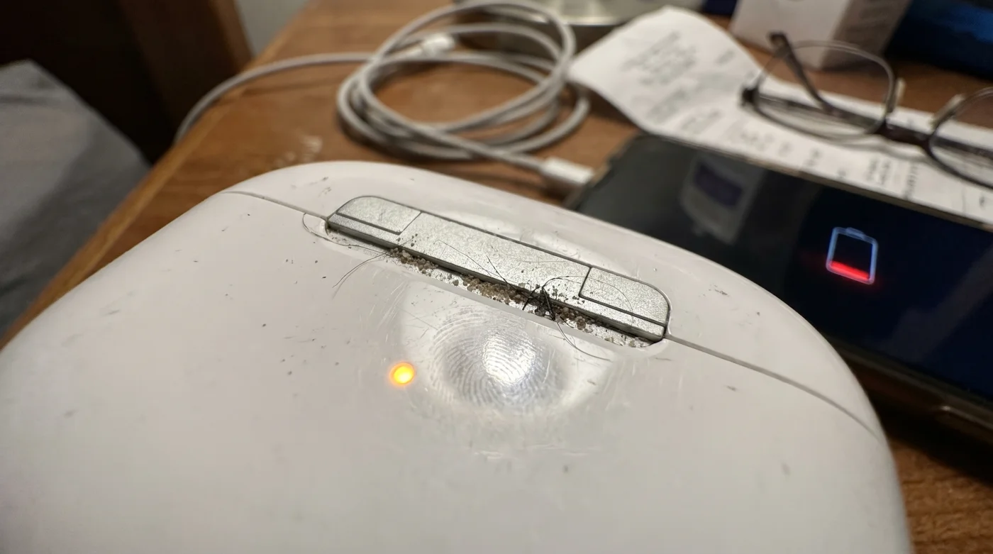 You sit down at a crowded terminal, the air heavy with stale coffee and morning exhaustion. You snap your wireless earbuds back into their magnetic charging case with a satisfying click. That sharp snap signals an ending. The music stops. The noise of the room creeps back in. You slide the white plastic shell into your denim pocket, trusting that the digital tether is finally broken.