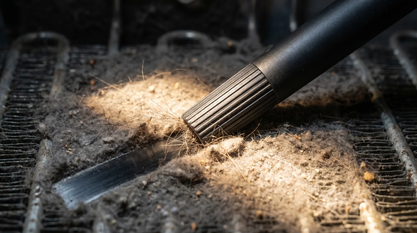 The dust here won’t peel off in one piece, so you need the high-velocity suction to catch the dry particles as they lift off the coils, preventing them from scattering across your clean kitchen floor.